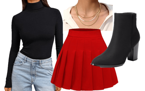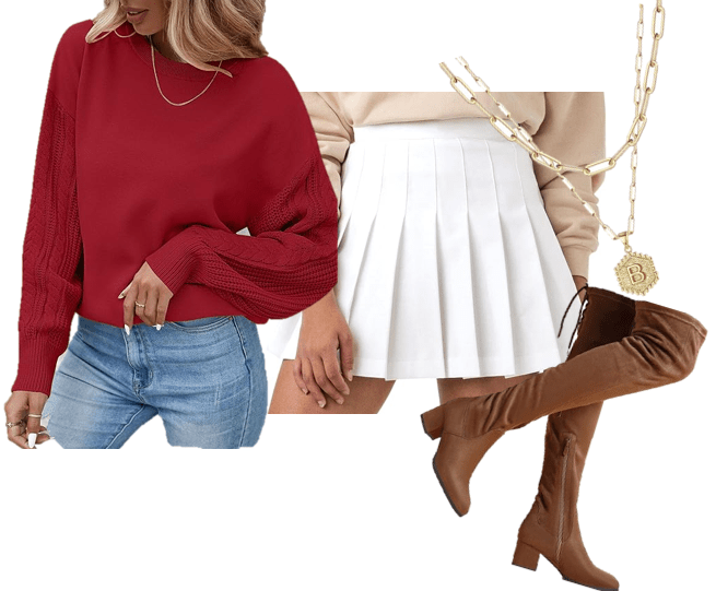 2. Red Sweater + Pleated Mini Skirt