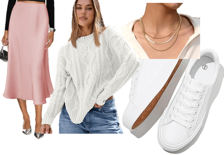 6. Pink Satin Skirt + White Sweater