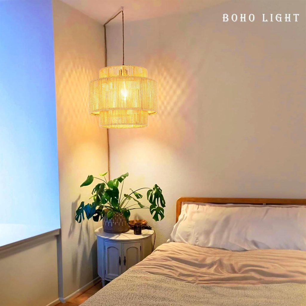 Rattan ceiling light with a unique hollow structure. When lit, the lampshade casts a beautiful and chic pattern on the ceiling.