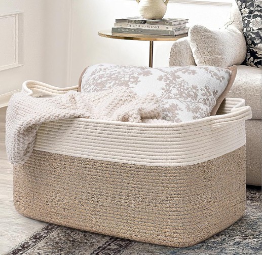 Storage baskets are both practical and decorative. Large wicker baskets are perfect for holding throw blankets in the living room, extra towels in the bathroom, or toys in family spaces.